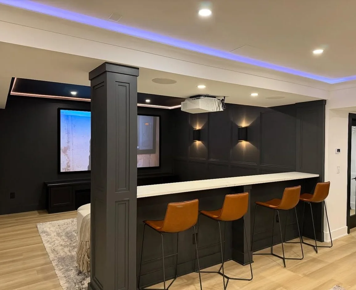 Final work included paint touch-ups, lighting adjustments, equipment testing, and cleanup. The completed space delivers a modern, polished family room designed for entertainment, comfort, and everyday enjoyment.