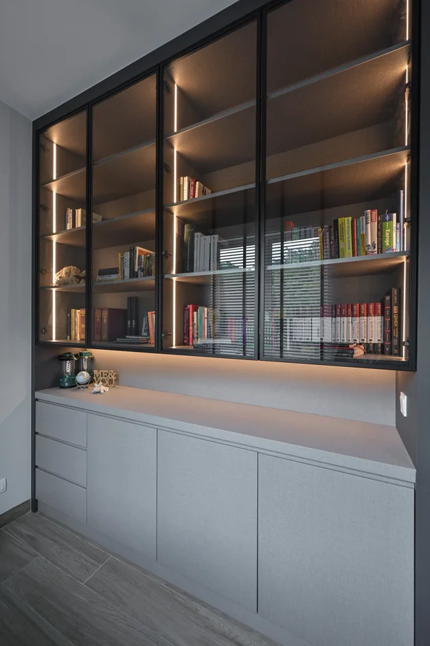 Custom-built furniture pieces were introduced to enhance both the aesthetics and functionality of the space. A modern desk was installed in the working zone, along with modular shelving units and built-in cabinets to maximize storage space and minimize clutter.