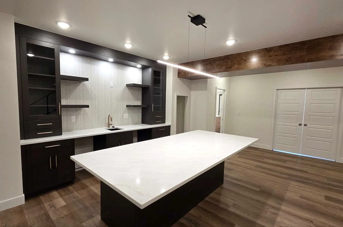 A custom-built kitchen island with sleek cabinetry and a white quartz countertop was added, providing additional workspace and a focal point in the room. The modern design complements the rest of the interior finishes.