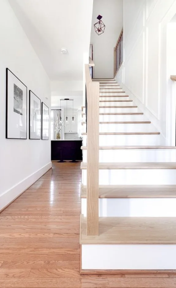 Installed new white risers and natural light-oak treads for a Scandinavian-inspired contrast.