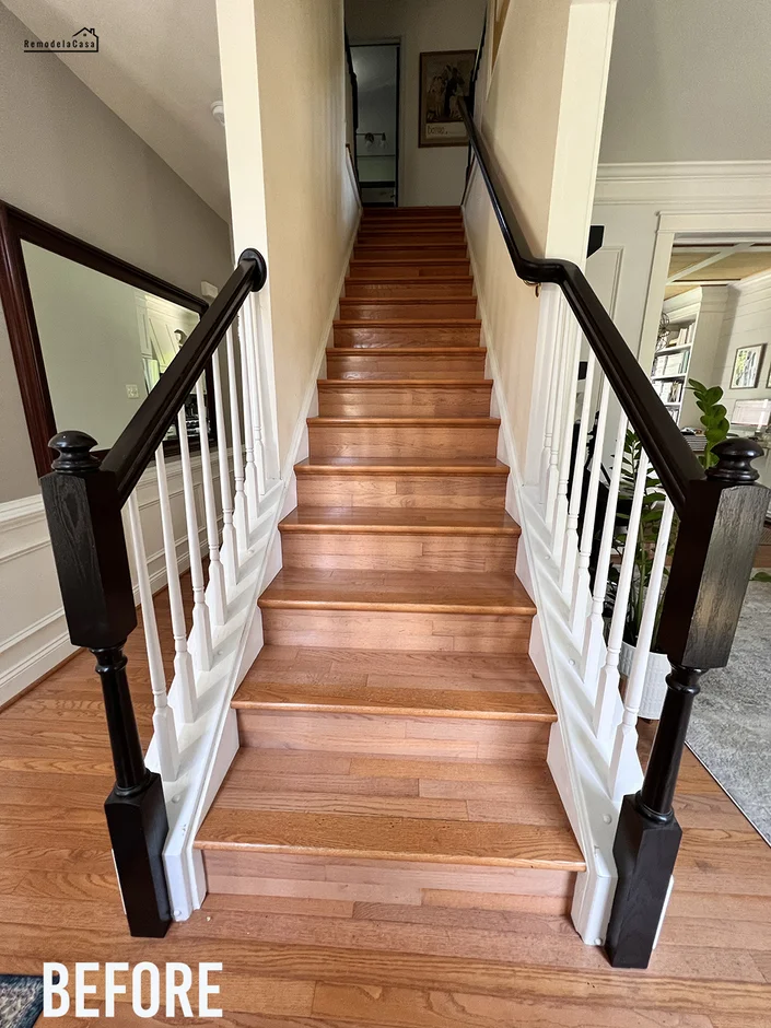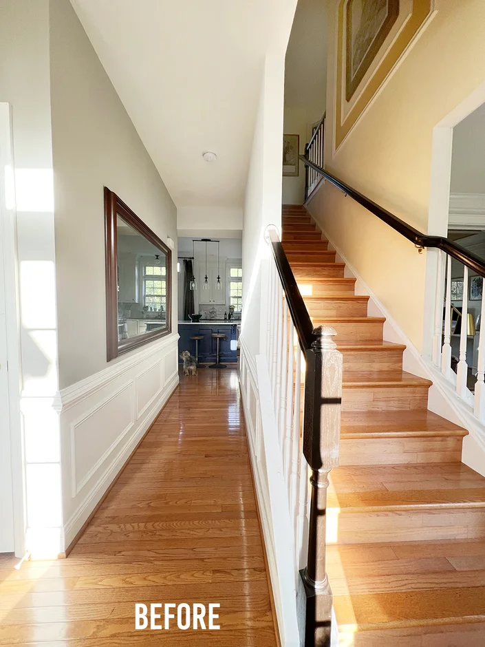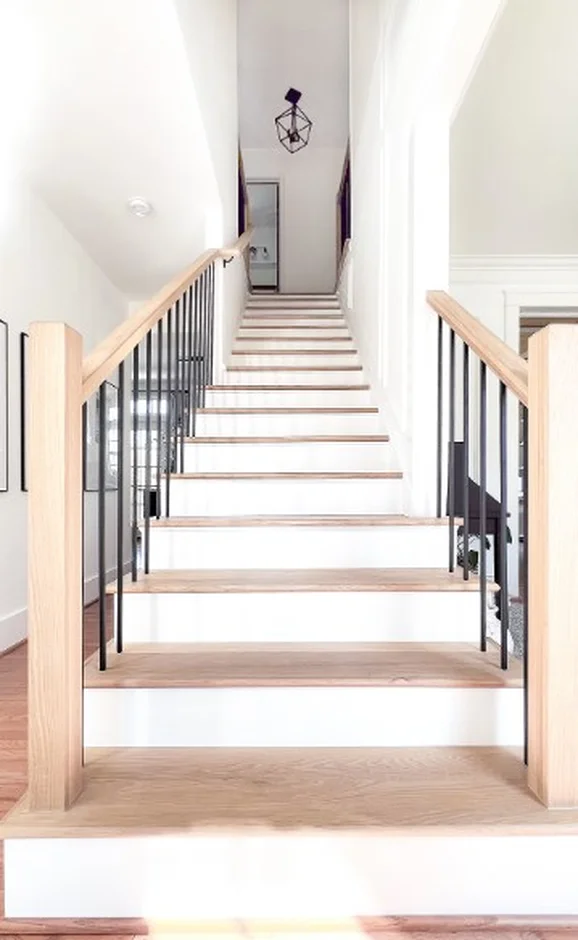 The once-traditional staircase is now a sleek, modern centerpiece. Light wood tones, crisp whites, and black metal accents create a timeless look that blends seamlessly with the rest of the home. The entryway now feels brighter, wider, and significantly more contemporary.