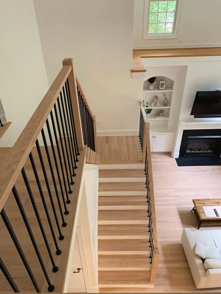 This staircase renovation refreshed a heavy, traditional design into a sleek, contemporary feature. With black metal spindles, natural oak wood tones, and clean lines, stairs now feel open, elegant, and fully aligned with home's modern style.