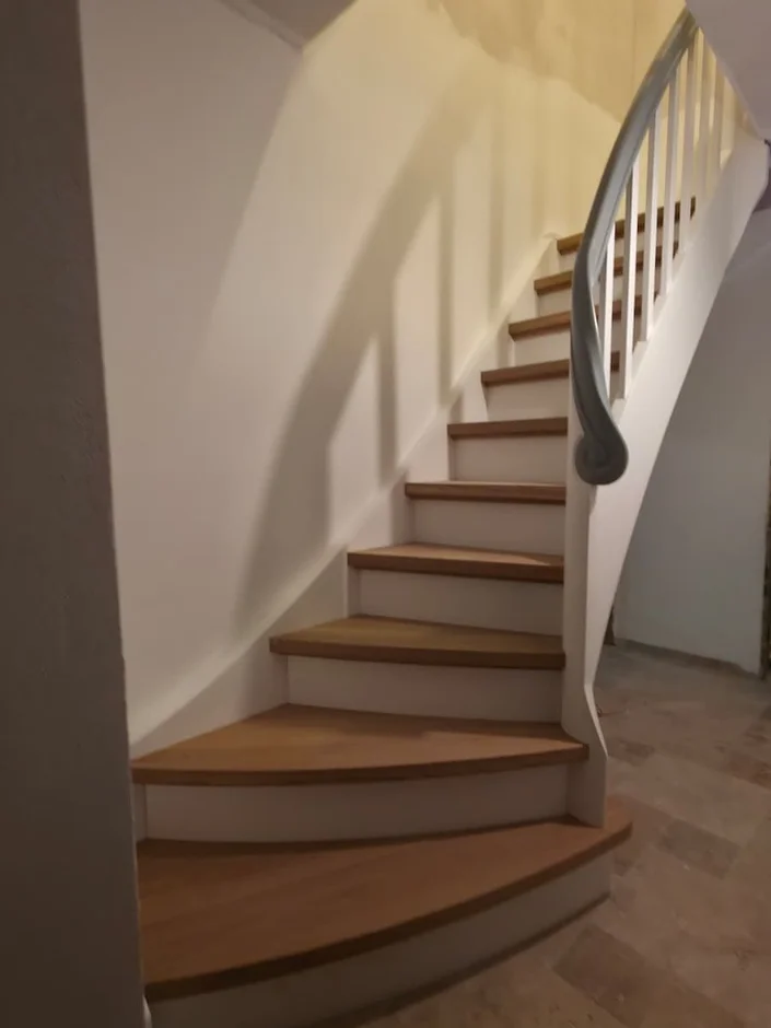 Refinished handrail and posts in warm oak for a natural, timeless touch. -