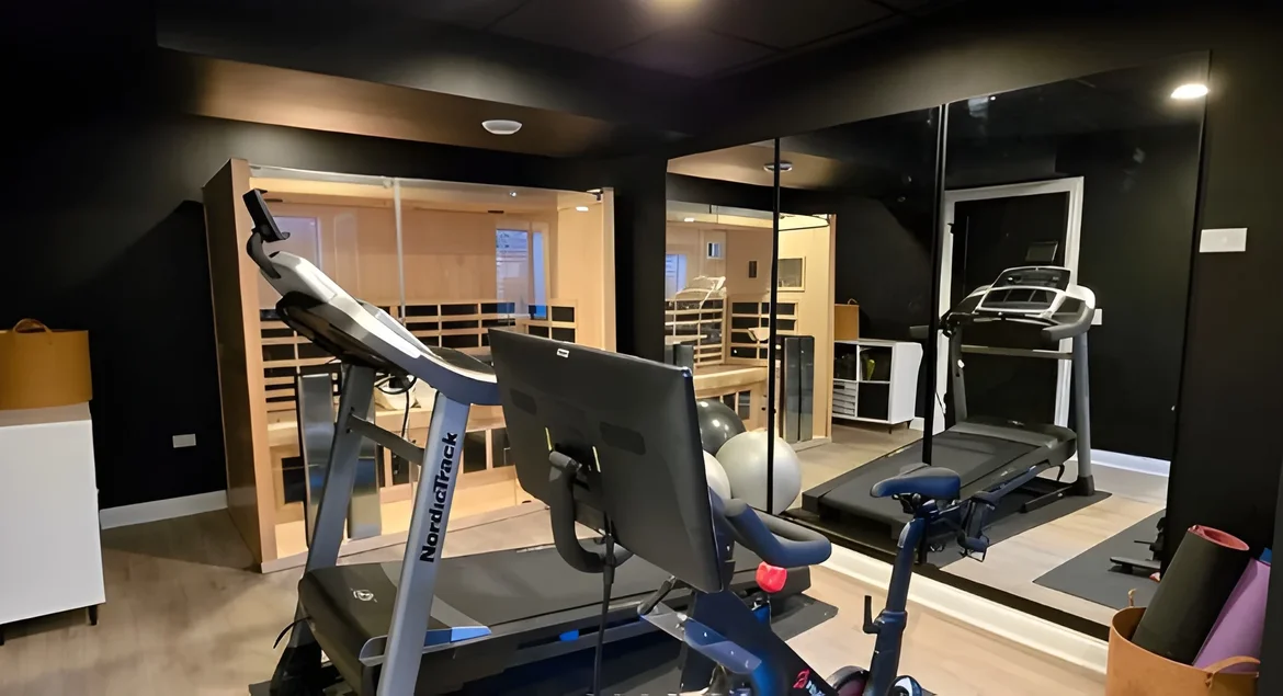 Added a glass-enclosed gym/office area, maximizing natural light while keeping the room visually open and modern.