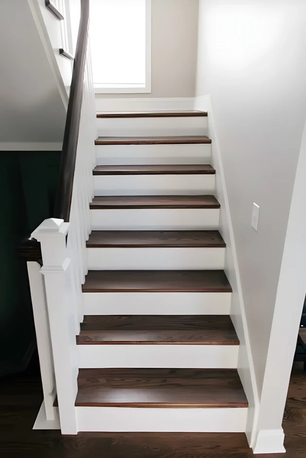 Tread Refinishing: The stair treads were refinished or replaced with dark-stained hardwood, providing a rich, warm tone that contrasts beautifully with the white elements.